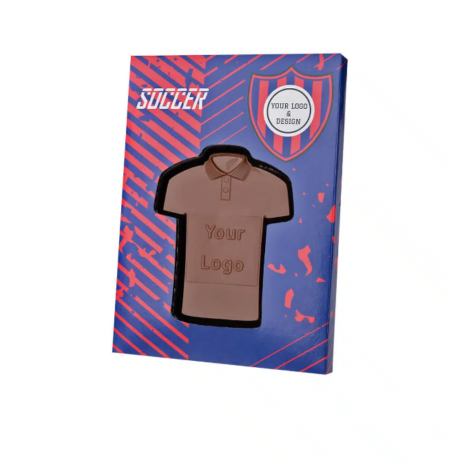 Personalised moulded chocolate football t shirt within a printed box. Fully printed with your own artwork. 65g