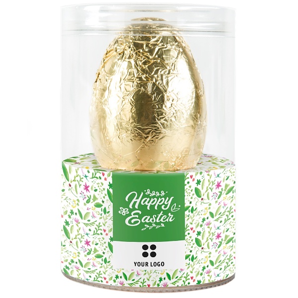 A clear gift box 70x100mm fully printed on the base and label with your own logo and design. Containing one foil wrapped 30g chocolate Easter egg.